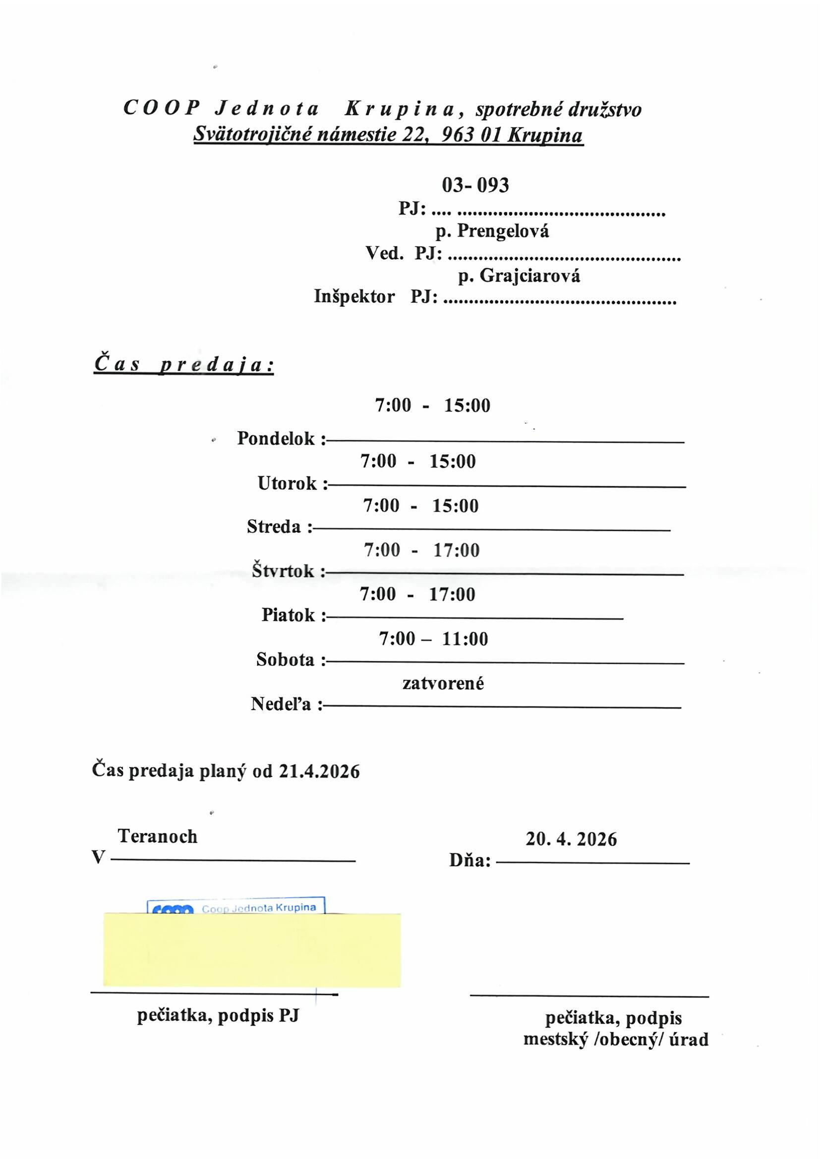 Zmena času predaja COOP Jednota Terany